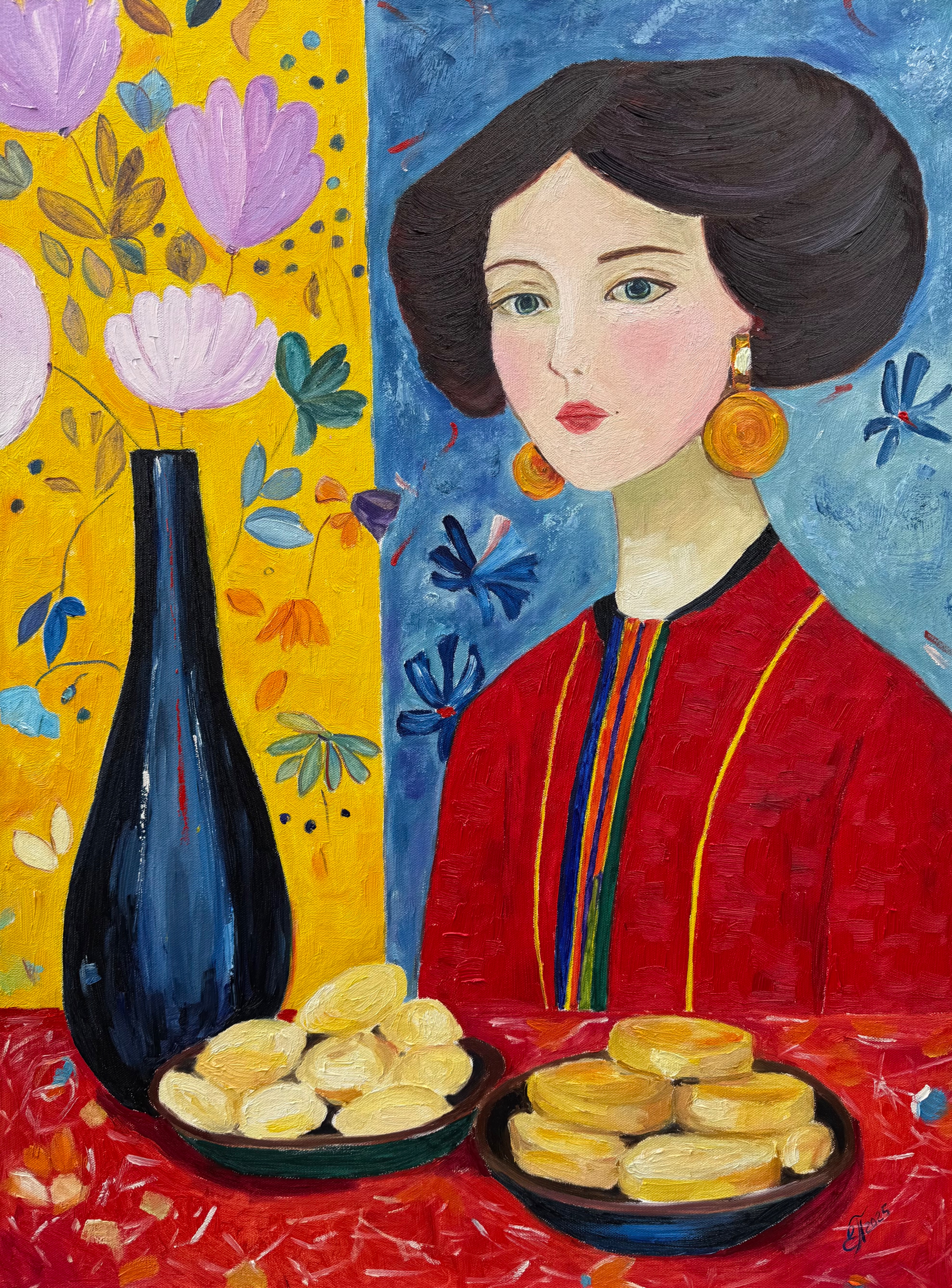 В центре картины — Альбина, женщина, чья красота раскрывается не в очевидности, а в глубине. Её аккуратная, тщательно уложенная причёска подчёркивает благородство черт, а традиционное платье словно хранит в себе историю её рода. В её спокойном лице таится едва уловимая загадка: взгляд мягко уходит в сторону, будто она слышит тихую мелодию своих мыслей, недоступных никому больше.