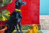 Окружение собаки также прорисовано с большой любовью к цвету и фактуре. На заднем плане — ярко-красная стена, её насыщенный цвет создаёт ощущение тепла и драматизма, подчёркивая тёмный силуэт пса. Слева — большое пышное растение в горшке, его тёмно-зелёные листья добавляют композиции естественности и контраста.