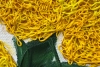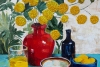 The painting depicts a sunny still life, painted in oil using an unusual technique — thin streams of paint, squeezed out with a culinary syringe, create voluminous, multilayered «golden balls». Bright yellow flowers are gathered in an expressive bouquet, standing in a large, richly red bottle that serves as a vivid accent in the composition.