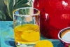 In the background, large decorative monstera leaves are softly discernible, emphasizing an atmosphere of warmth and natural harmony. On the turquoise table, there is a glass of refreshing lemonade and several bright lemons, as if just placed by the artist's hand.
