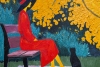 Фон картины наполнен золотыми и жёлтыми оттенками опавших листьев, создающих мягкую, почти приглушённую атмосферу уходящего времени. Контраст между насыщенным красным платья и спокойной осенней палитрой подчёркивает эмоциональное напряжение между внутренним миром героини и окружающей природой.