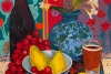 This still life is filled with a sense of coziness, warmth, and quiet joy. The yellow flowers in the vase become a source of light within the composition, as if illuminating the space from within. The tray on the table unites simple yet expressive elements: a glass with a drink, juicy pears, and scattered red crabapples, adding rhythm and a bright color accent.