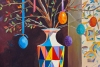 At the center of the composition is a bright ceramic vase with a geometric pattern inspired by Gaudí’s style. Red, blue, and yellow ceramic forms create a lively rhythm and give the work a contemporary sound. In the vase is a branch with budding shoots and young green leaves, a symbol of awakening and renewal. Painted Easter eggs hang on the branches on multicolored ribbons — fragile symbols of traditions, family memory, and childhood joy.