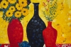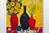 A bright, modern still life filled with light and warmth. A floral red tablecloth and rich yellow walls create a feeling of a sunny space. Three vases—two red, shaped like pitchers, and one deep dark blue—form a lively color composition.