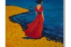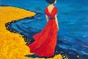 Девушка в развевающемся красном платье стоит на берегу, глядя вдаль на изумрудно-голубое море. Морской бриз касается её ткани и волос, наполняя композицию движением и дыханием пространства. Ярко-жёлтый берег словно отделяет землю от воды — реальность от мечты.