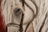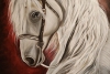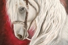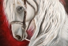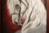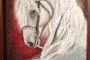 This painting depicts a beautiful white horse with a long, wavy mane. The horse looks to the side, its gaze full of calmness and wisdom. The background of the painting is dark, with red and brown tones, creating a contrast with the white color of the horse and giving the image depth and drama. The painting is perfect for horse and nature lovers, as well as for those who appreciate beauty and harmony in interior design.