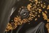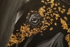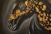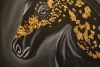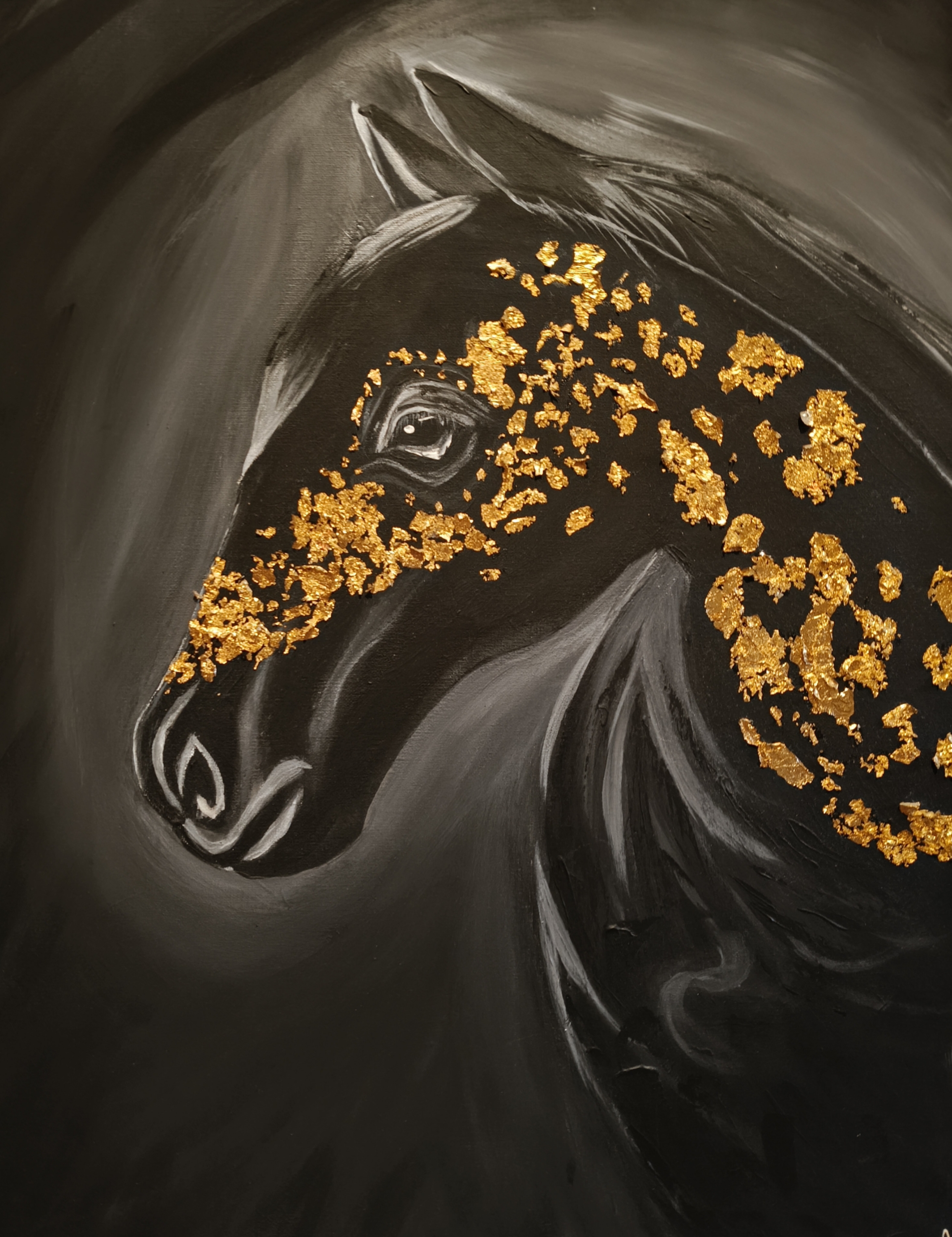 The painting depicts a horse's head surrounded by golden glitter, creating an impression of magical radiance. The horse looks directly at the viewer, its eyes full of mystery and wisdom. The background of the painting is dark, which enhances the contrast and makes the image even more mystical.