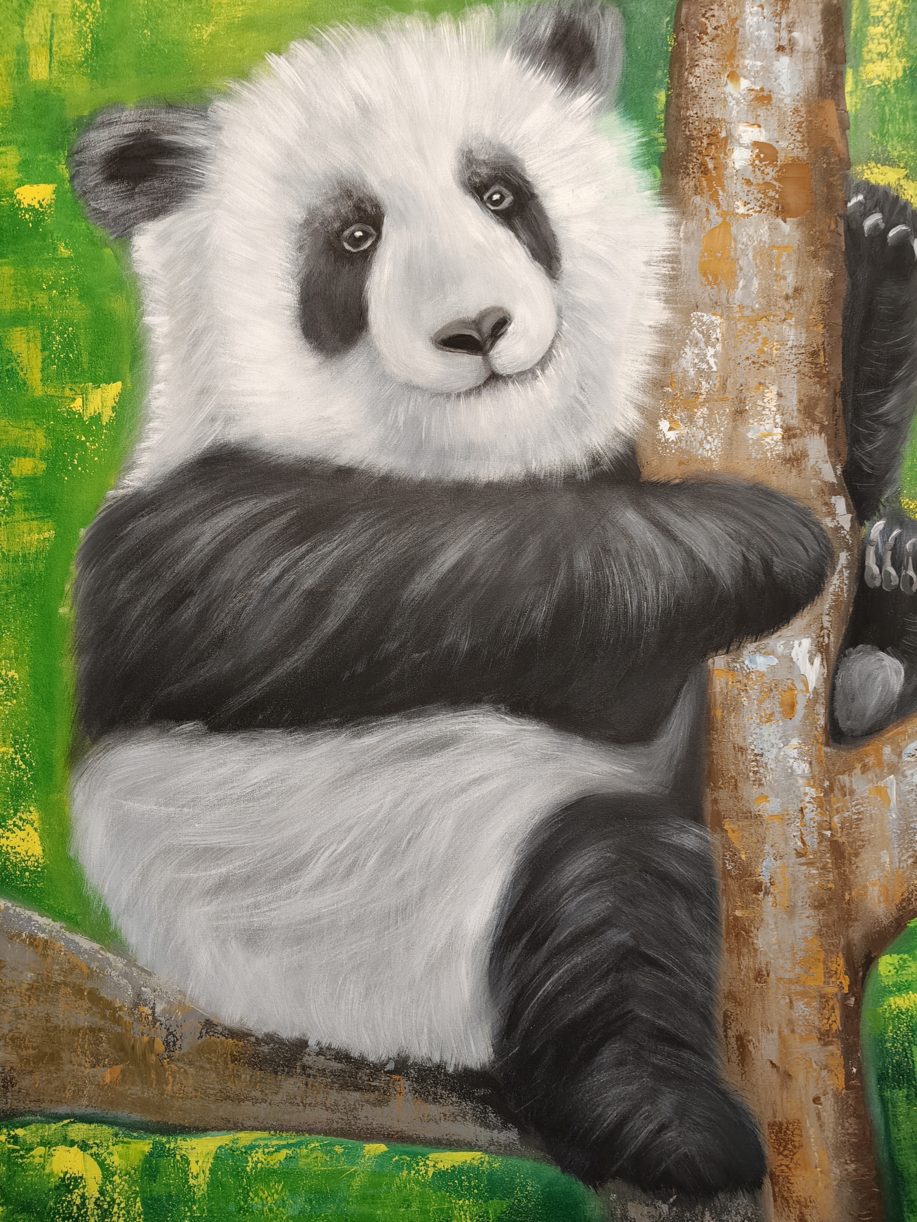 На картине изображён милый панда, который уютно устроился на ветке дерева. Его пушистая шерсть контрастирует с зелёным фоном, создавая ощущение гармонии с природой. Панда смотрит прямо на зрителя, словно приглашая в свой волшебный мир. Эта картина наполнена теплом и уютом, она станет прекрасным украшением для вашего дома и подарит вам ощущение спокойствия и радости каждый день.