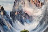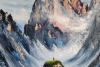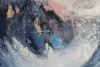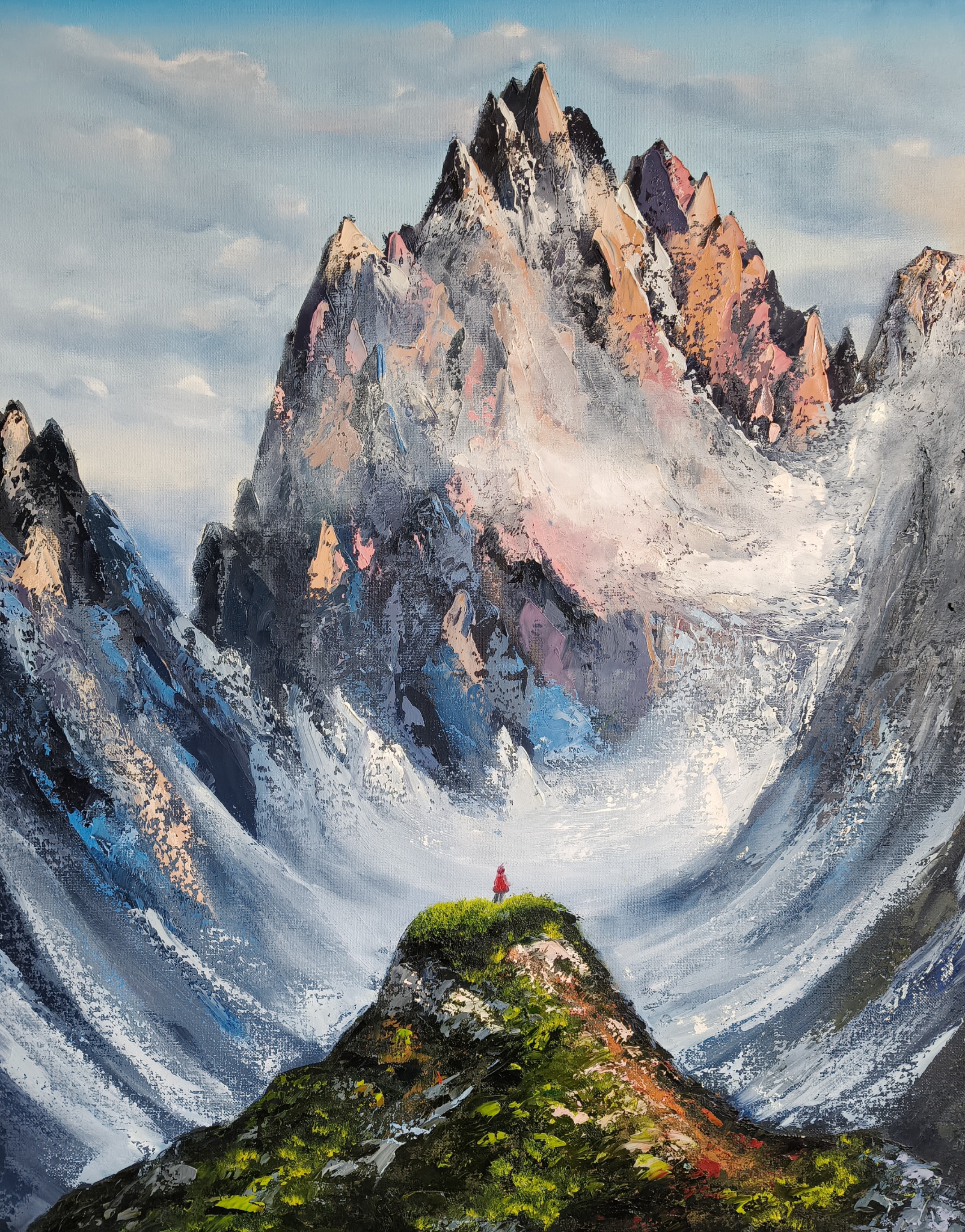 Перед вами картина, которая переносит вас в волшебный мир гор. На ней изображены величественные вершины, покрытые снегом, которые возвышаются над облаками. Небо окрашено в нежные оттенки голубого и розового, создавая атмосферу утренней свежести и спокойствия. В центре композиции находится человек, стоящий на вершине горы и любующийся открывающимся видом. Его фигура кажется крошечной по сравнению с величием природы, что подчёркивает масштаб и мощь горного пейзажа. Эта картина вызывает чувство восхищения и умиротворения, приглашая зрителя погрузиться в мир красоты и гармонии.