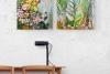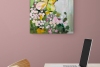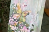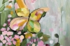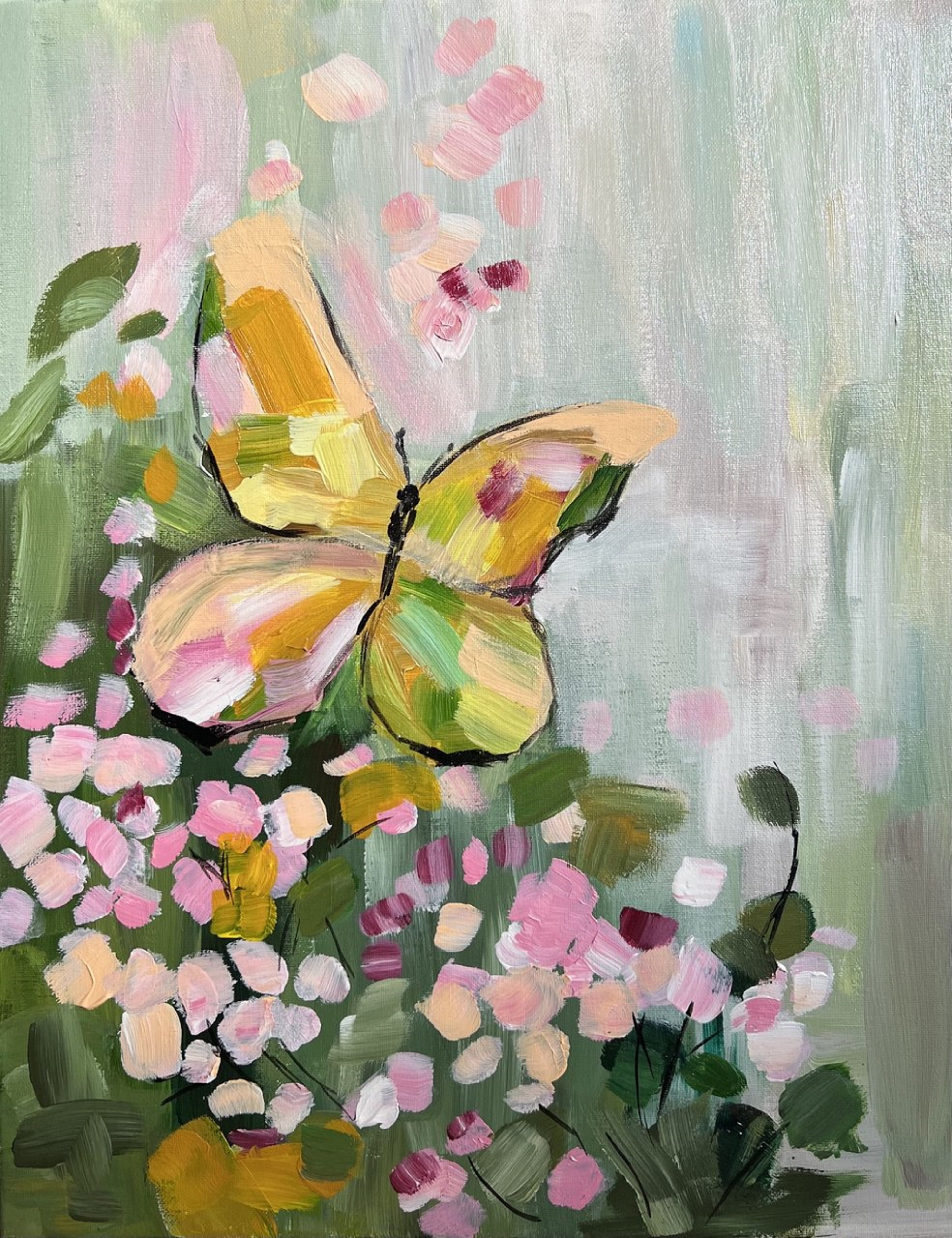 Изящная желтая бабочка парит над ковром розовых соцветий, изображенных в насыщенных зеленых и розовых тонах на холсте. Написанная в стиле импрессионизма акриловая работа передает мгновение весеннего дня – хрупкое, мечтательное, наполненное движением и цветом.
