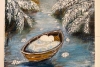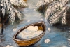 Картина выполнена в наивном и метафорическом стиле. Маленькая деревянная лодка мягко плывёт по спокойной реке. Внутри на сложенном одеяле спит белая птица — хрупкий символ покоя и внутренней тишины. Вокруг лодки плывут белые цветы, отражая мягкий свет.