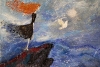 Женщина с огненными волосами стоит на краю скалы, глядя в бескрайнее небо.
