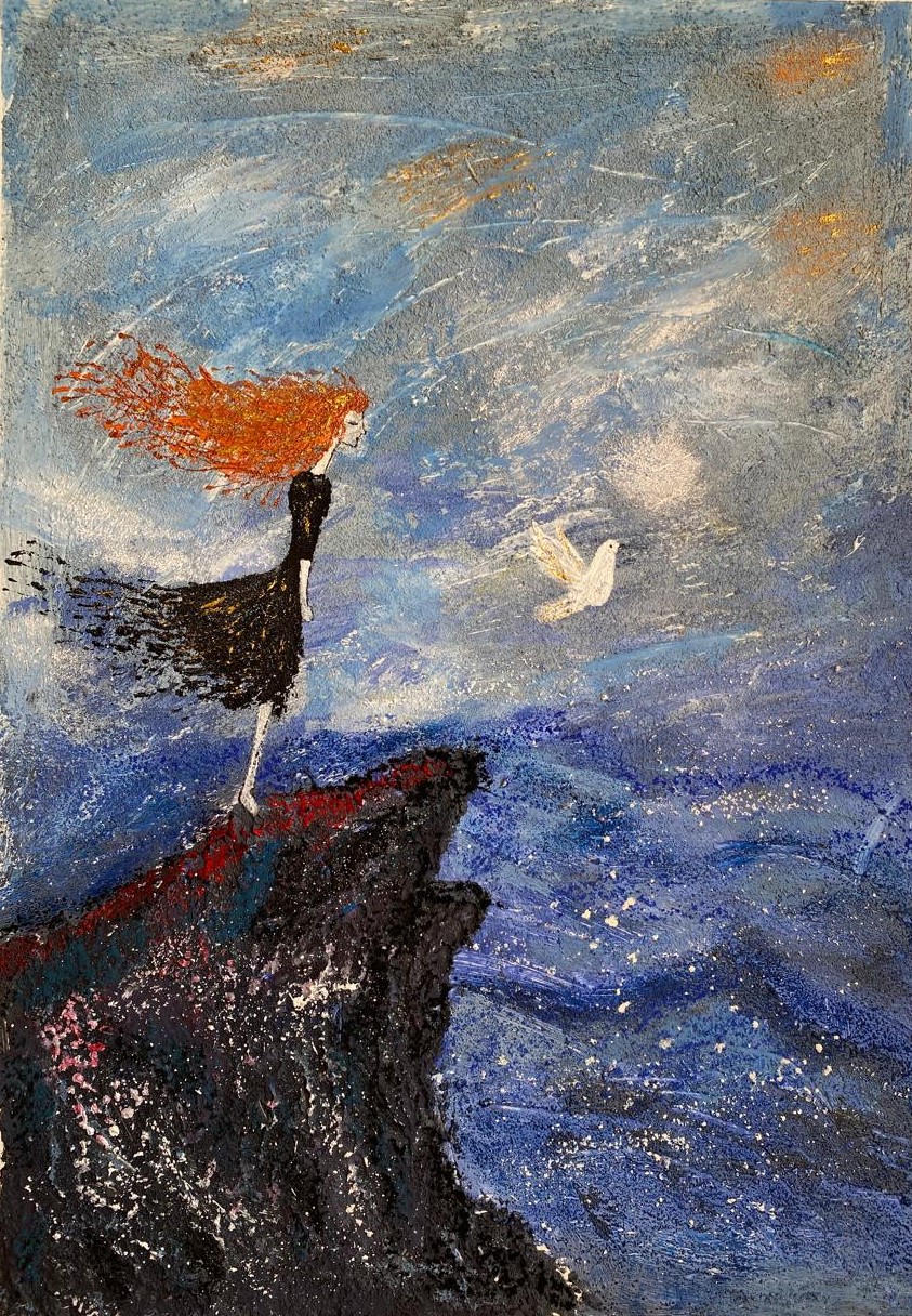 Её чёрное платье растворяется в ветре — символ освобождения, смелости и перехода страха в свободу.