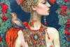 В центре композиции — женщина, чья красота завораживает. Её кожа кажется фарфоровой, а профиль, обращённый в сторону, полон достоинства и лёгкой меланхолии. Особое внимание привлекает её головной убор — настоящее произведение искусства, пышное, многослойное, с крупным красным бантом, украшенное золотом и драгоценными камнями. Эти детали, наряду с массивным, богато украшенным ожерельем, создают образ восточной царицы или знатной дамы.