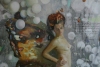 The woman’s surroundings are also filled with symbolism. Light, almost weightless spheres resembling dandelion seeds scatter in the air, enhancing the sense of fragility and transience. Graphic lines and gray tones of the background contrast with the vibrancy and brightness of the central figures, emphasizing the dialogue between the real and the metaphysical.