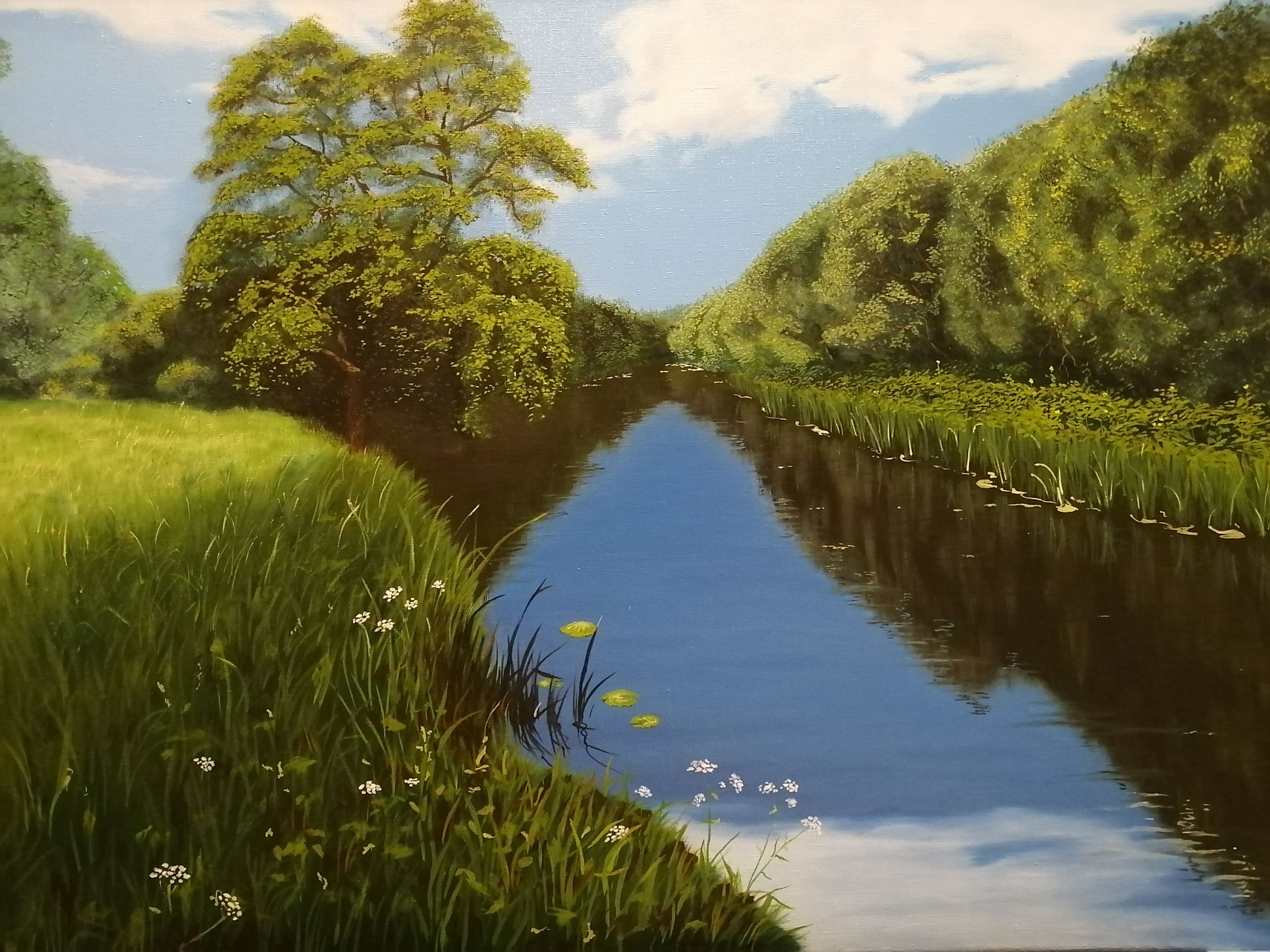 The composition of the painting is built around a water artery — a calm dark blue canal or river that extends deep into the canvas, creating a strong perspective and a sense of infinity. The water surface perfectly reflects the sky and surrounding greenery, giving the scene depth and dimensionality.
