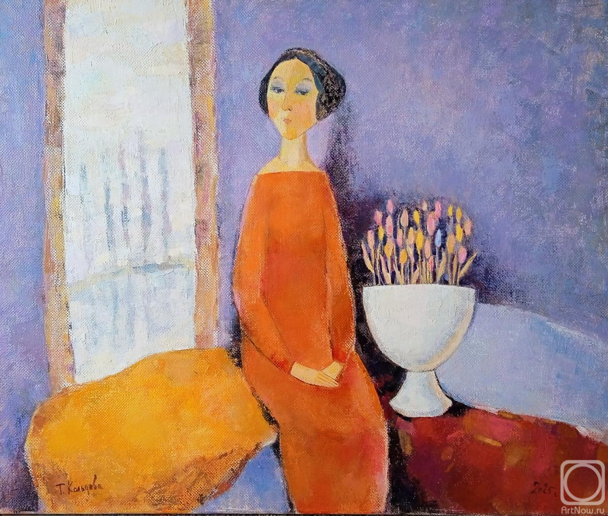 The painting by Tatyana Koltsova «Spring, March» is a delicate and refined piece filled with an atmosphere of anticipation and expectation. The canvas depicts a female figure in a long orange dress sitting by the window. Her image is simple but full of inner grace. Calm, restrained facial features, hands folded on her knees — all speak of quiet contemplation, introspection, and waiting for something important.