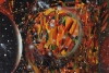 The central element of the composition is something resembling a pulsating nebula, wrapped in a network of thin lines that seem to reflect the movement and interaction of cosmic objects. Bright, contrasting colors — from dark red and orange to rich yellow and blue — create a dynamic atmosphere full of energy and life.