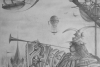 The painting by Pavel Korzukhin «Утро отплытия» is a black-and-white canvas filled with an atmosphere of anticipation and the excitement of a journey. The main character, dressed in an old-fashioned costume, holding a pipe, seems to signal the beginning of some grand event. His gaze is directed into the distance, towards the sky, where a remarkable spectacle unfolds.