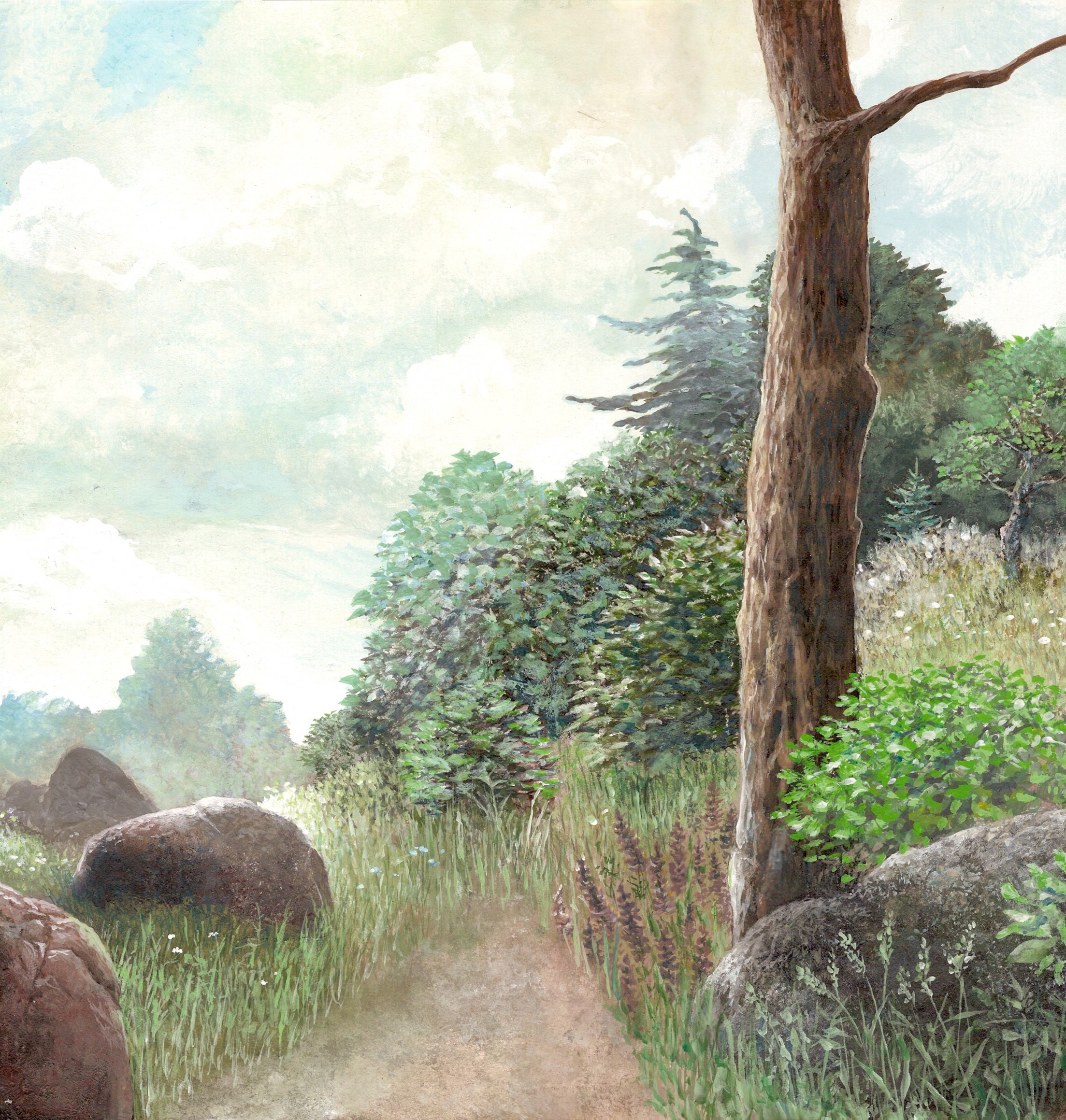In the foreground is a path winding through tall grass and large boulders. It seems that the artist took his walks along this path, breathing in the fresh air and admiring the surrounding beauty. Among the grass are delicate blossoms that bring liveliness to the composition and set color accents.