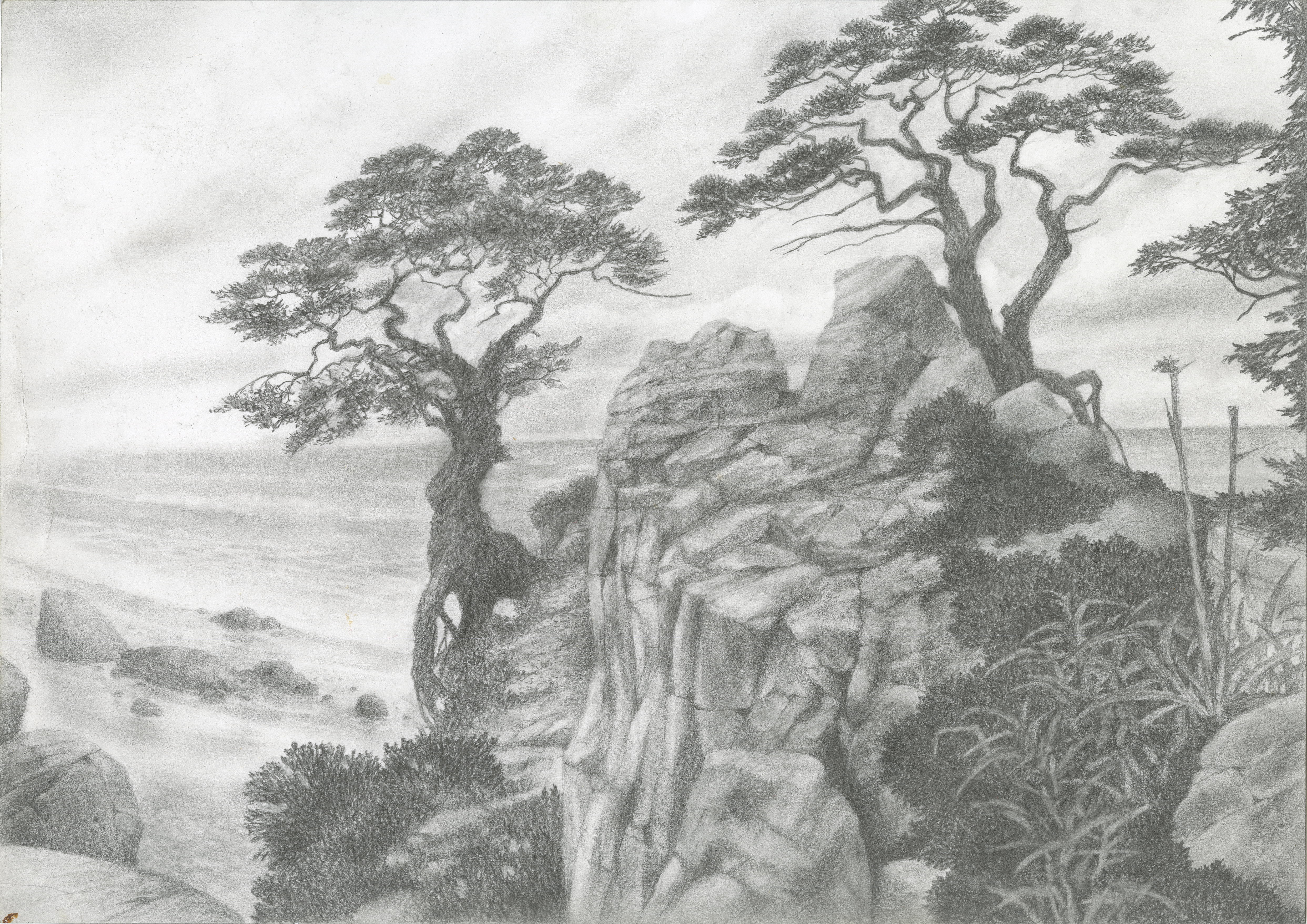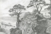 The artist masterfully conveys the texture of the rocks, their roughness and power. Light and shadow play on the stone surfaces, emphasizing their relief and creating a sense of volume. The pines, depicted with incredible detail, seem to have roots gripping the rocky soil, resisting winds and time. Their curved forms lend the landscape drama and symbolism.