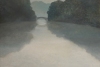 По обеим сторонам реки раскинулись густые, тёмные деревья, их кроны создают ощущение уединения и защищённости. На дальнем плане, на фоне лёгкой дымки, виднеется арка моста, элегантно вписывающаяся в пейзаж. Мост, словно связующее звено, уводит взгляд зрителя вдаль, побуждая к размышлениям.