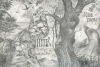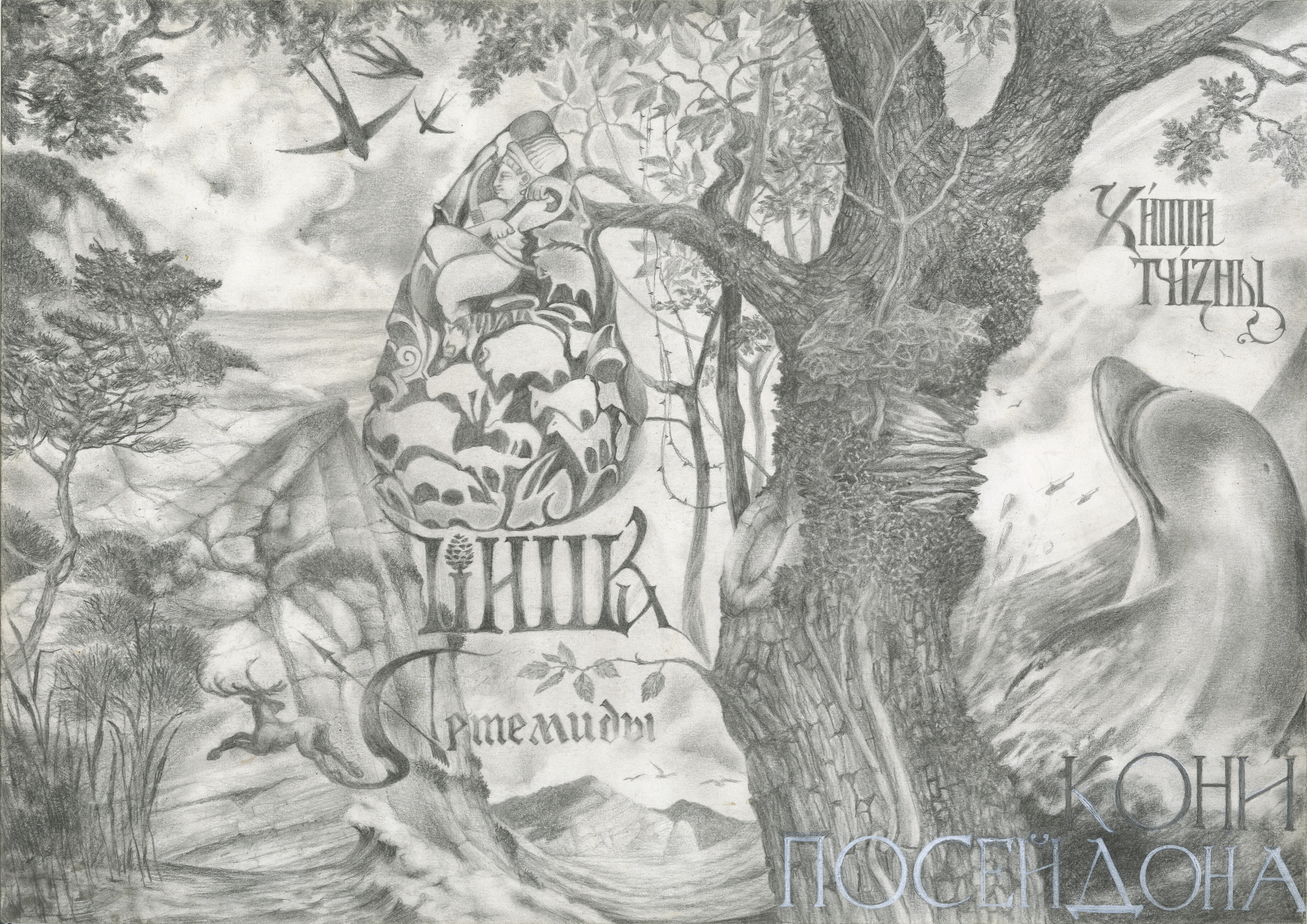 Работа Павла Корзухина — это сложная графическая притча, в которой античные архетипы сочетаются с сюрреалистическими образами. Художник мастерски сплетает два мира: лесную стихию Артемиды и бушующие воды Посейдона. В центре композиции — аллегорический образ Артемиды, чья фигура словно вырастает из самой земли, перекликаясь с символикой «шишки» как знака плодородия и природной магии.