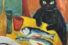Картина Анны Голубь «Кот и рыба» — обаятельное и полное юмора произведение, выполненное в экспрессивной манере. В центре сюжета — импозантный черный кот с пронзительными желтыми глазами, застывший в ожидании перед «уловом». Его поза и внимательный, почти человеческий взгляд придают картине театральность, делая кота главным героем этой бытовой сценки.
