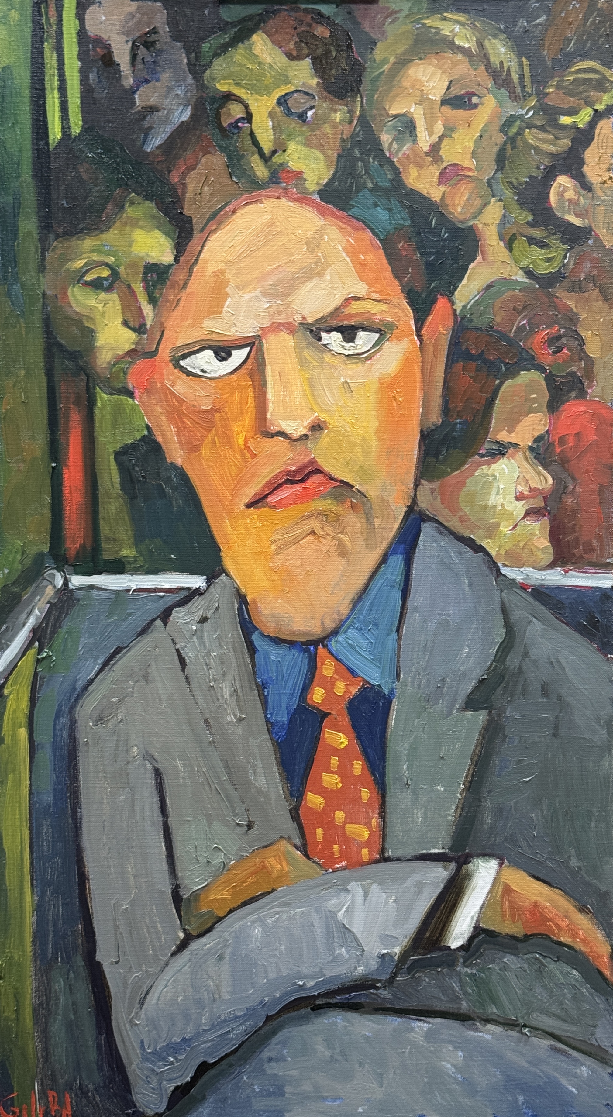 Главный герой полотна — мужчина с напряжённым выражением лица, написанный крупными фактурными мазками. Его взгляд, устремлённый прямо на зрителя, полон усталости и раздражения. Цветовая гамма картины приглушённая, с акцентом на жёлтые, серые и коричневые оттенки, что создаёт ощущение уныния и монотонности городского пейзажа. Тем не менее контрастные цветовые пятна на галстуке мужчины и размытые лица окружающих добавляют динамики и подчёркивают царящий вокруг хаос.