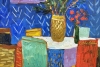 Художница использует яркую, насыщенную палитру: глубокий синий фон с ритмичными светлыми штрихами контрастирует с теплыми охристыми и красными оттенками стульев и декоративных элементов. Плотные, энергичные мазки делают изображение «живым», придают пространству особую динамику и объем. Еловые ветви в золотистой вазе становятся смысловым центром, символом предстоящего торжества.