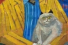 Центральное место занимает кот — пушистый, с огромными выразительными зелёными глазами, он кажется главной фигурой картины. Его взгляд, устремлённый прямо на зрителя, полон достоинства и лёгкой иронии. Мужчина в ярко-жёлтом пиджаке держит кота на руках.