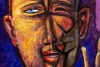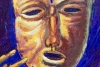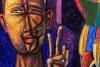 At the center of the composition is a face whose features are distorted and multifaceted, as if it consists of different masks or fragments of various personalities. The eyes, rendered in different styles, create a sense of confusion and inner conflict. One hand, raised to the face, seems to be removing a mask, revealing the true «self», while the other points to a symbol of victory or peace.