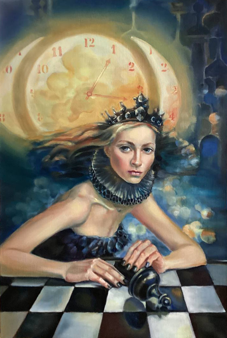 В центре композиции — царственная женщина с короной, замершая перед черно-белой шахматной доской. В её руках падающая чёрная шахматная фигура, символизирующая победу, силу и метаморфозу. Согласно правилам шахмат, пешка, достигшая края доски, может превратиться в любую фигуру. А ферзь — самая могущественная из всех фигур. За ней сияет золотые часы на фоне лунного неба, подчёркивая темы времени, судьбы и неизбежности перемен.