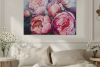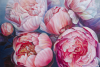 Эта большая акриловая картина (60x80 см) запечатлевает крупный план пионов в полном цветении, их многослойные лепестки переполнены жизнью и цветом. Каждый цветок кажется живым — мягкие розовые, румяные и коралловые оттенки гармонично сочетаются с тонкими акцентами лаванды, бледно-голубого и кремово-белого.