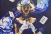 This original acrylic painting (50 x 50 cm) depicts a poetic and slightly theatrical scene, centered around a mysterious female figure surrounded by playing cards, roses, and floating symbols of love and fate. The composition evokes associations with elegance, romance, and intrigue, blending vintage charm with ethereal symbolism.