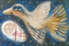 Картина Яны Поярковой «Птица счастья» — трогательная и сказочная интерпретация классического сюжета о рождении новой жизни. В центре композиции — фантастическая птица с добрыми, широко раскрытыми глазами, которая бережно несет в клюве спеленатого младенца. Фигура птицы выполнена в мягких золотисто-бежевых тонах, а её оперение кажется пушистым и уютным, что подчёркивает атмосферу нежности и безопасности.