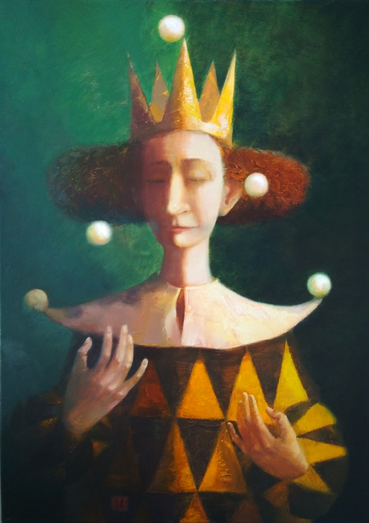 Картина «Жонглер» передаёт идею о том, что истинное мастерство жизни заключается в умении сохранять неподвижный центр посреди вечного движения обстоятельств. Герой одновременно и «шут» (в сакральном, карнавальном смысле), и «король» своего внутреннего мира. Свет и тишина: мягкий, золотистый свет, исходящий словно изнутри персонажа, подчёркивает тему просветления. Это образ человека, который нашёл точку опоры внутри себя и превратил суету жизни в магический ритуал обретения равновесия.