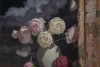 The exquisite composition depicts a bouquet of peonies, elegantly arranged against a backdrop of a cloudy sky.