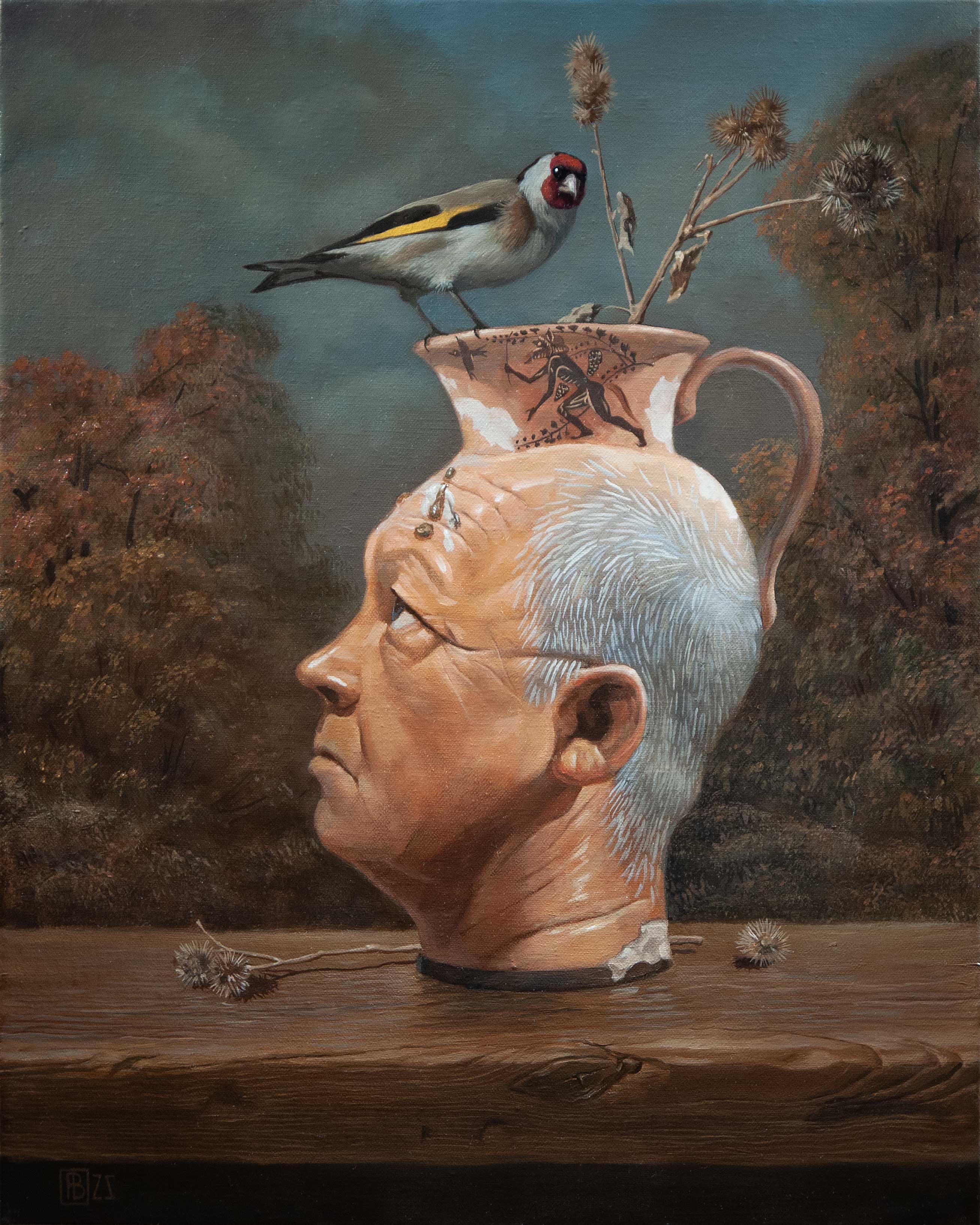 Слияние человеческого лица с керамикой подчеркивает идею «объективации» творца, превращающегося в артефакт. Щегол, спокойно сидящий на венце этого необычного сосуда, выступает символом души или свободного вдохновения, парящего над тяжестью бытия. Сдержанная цветовая палитра и детализированный фон напоминают фламандские натюрморты, где каждый элемент — от засохшего чертополоха до мельчайших морщин — несет символическое значение. Это полотно — экзистенциальная загадка, в которой художник иронично примеряет античную маску, призывая зрителя задуматься о бренности и вечности искусства.