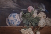 Композиция сцены построена вокруг опрокинутой китайской вазы, из которой выпадают крупные белые пионы, частично свисающие с деревянной полки.