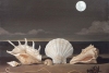 The painting by Sevarty titled «Ночная прогулка жуков-носорогов» transports the viewer into a surreal fairy tale. Against the backdrop of a serene night landscape illuminated by the full moon, a mysterious scene unfolds: majestic sea shells stand frozen on the shore like ancient monuments of nature, while a tiny rhinoceros beetle pulls a thin thread, as if leading us beyond the visible world.
