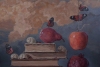 The composition is built on breaking familiar laws. A pile of old books, symbolizing knowledge and the past, serves as a pedestal for a red pear and a series of tiny white shells. On the right, defying gravity, a perfect red apple hangs suspended by a thin thread, and nearby flutter butterflies with fiery red wings. A pomegranate, heavy and dark, gives stability to the scene.