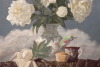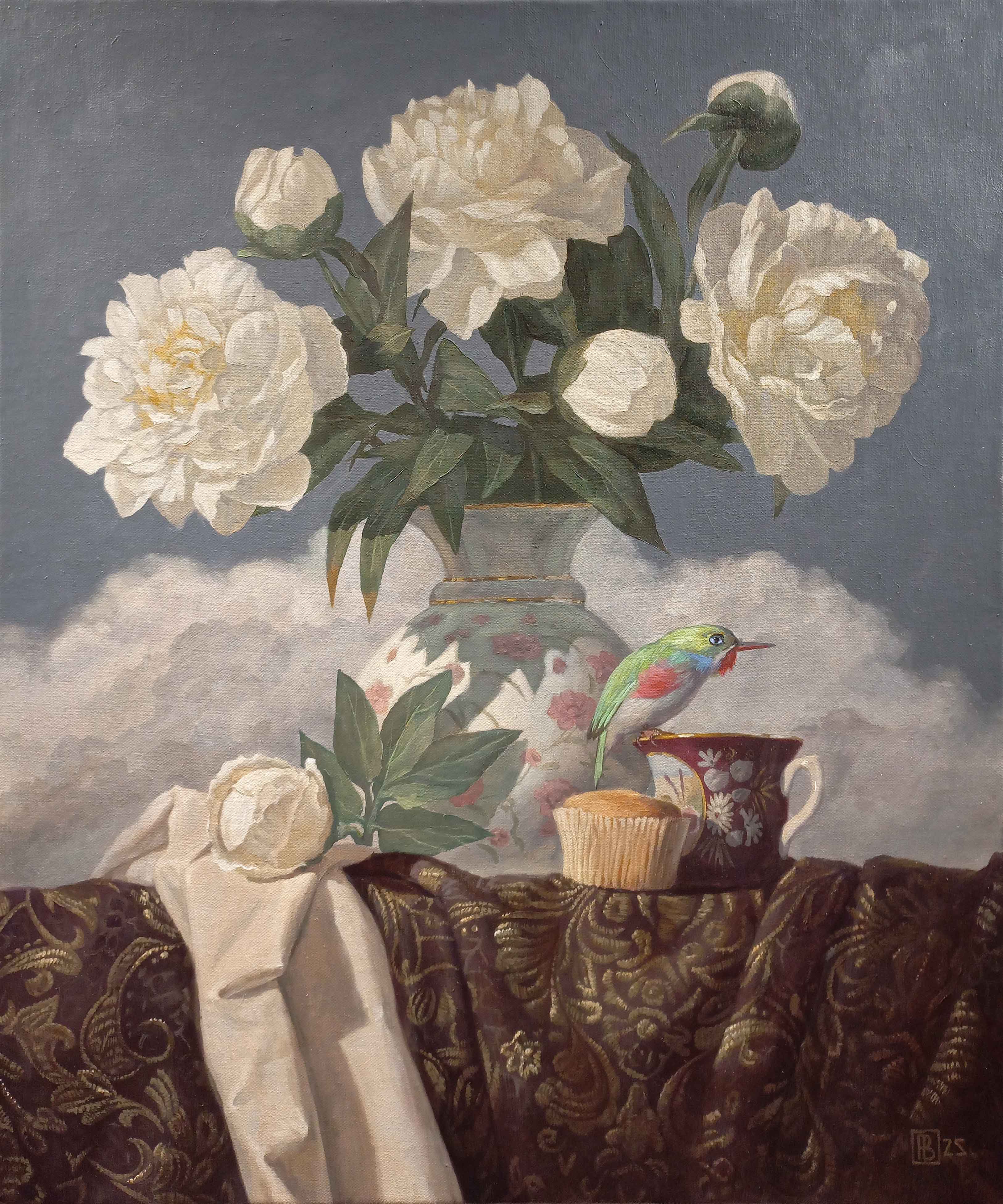 The painting by Sevarty «Mini Muffin for Cuban Tody» is a delicate canvas where the material world meets the poetry of the unreal. At the center of the composition is an exquisite vase, immersed in lush white peonies, beneath which, as if floating on clouds, lies a morning still life. Next to the miniature muffin perches a tiny bird — the Cuban tody, whose bright plumage brings a touch of lively energy to the calm color scheme.