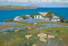 На холме, посреди цветущего поля, расположилась небольшая деревушка с белыми домами, крытыми зелёной черепицей. Дома выглядят уютными и обжитыми, создавая ощущение гармонии между человеком и природой. На заднем плане раскинулось бескрайнее синее море, в глади которого отражается яркое небо с лёгкими белыми облаками.