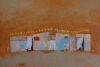 На картине изображён ряд невысоких построек, напоминающих сельские или дачные домики. Их стены покрыты лёгкой штукатуркой, местами облупившейся, что придаёт им состаренный, обжитой вид. Отдельные окна и двери выделены яркими, но не кричащими цветами — красным и голубым. Над крышами построек тянется гирлянда из лампочек, мягко освещающая пространство и создающая ощущение праздника. Некоторые окна занавешены светлой тканью, которая колышется на ветру, придавая картине динамику и живость.