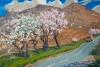At the center of the composition are blooming almond trees, their branches abundantly covered with white-pink flowers. They are set against picturesque mountains, whose slopes are covered with brown soil showing traces of agricultural activity — possibly planting or soil cultivation. On the right side of the painting, there is a road stretching into the distance, creating a sense of path and movement.