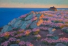 The painting by Olga Konorova «Wild carnation» is a refined and delicate landscape, full of light and color, conveying the atmosphere of a summer evening on the seaside. In the foreground of the painting, a slope is spread out, dotted with clusters of small pink flowers, presumably wild carnations. Their gentle shade contrasts with the gray, sunlit stones that add volume and texture to the composition.