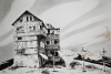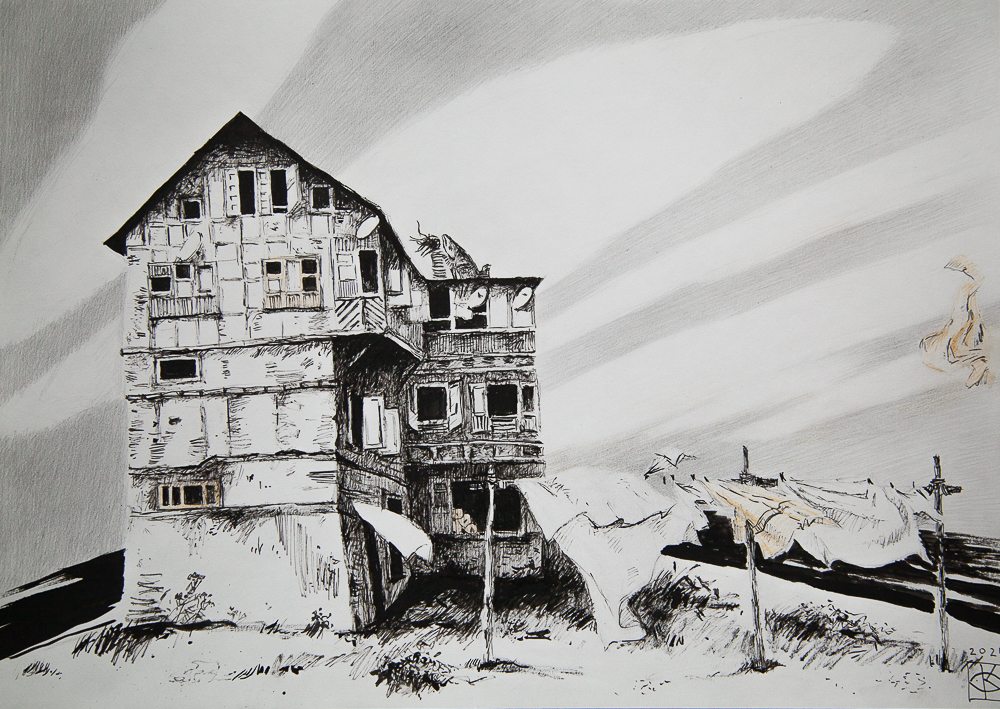 Картина Ольги Коноровой «Приметы и поверья» представляет собой монохромное произведение, выполненное в графической манере, которое вызывает множество вопросов и ассоциаций. На переднем плане изображено многоэтажное здание, напоминающее старую гостиницу или доходный дом. Его архитектура кажется несколько хаотичной, с множеством пристроек, балконов и окон разной формы. Здание выглядит обветшалым, с облупившейся штукатуркой и следами времени.