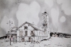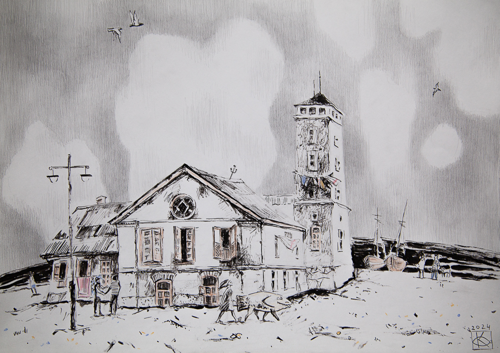 Картина Ольги Коноровой «Церковь морских птиц» — это атмосферная графическая работа, переносящая зрителя в приморский городок с его неповторимым колоритом. Сюжет картины рассказывает о путешествии девочки и её сказочного друга — рыбы. Эта история воплощена в изображении старинного здания, которое, судя по всему, и является главной героиней.