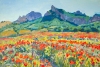 Majestic mountain ranges rise in the background. Their dark, rich blue-green and purple tones contrast strikingly with the blazing field, giving the landscape depth and monumentality. A clear high sky completes the picture, emphasizing the atmosphere of a clear sunny day.
